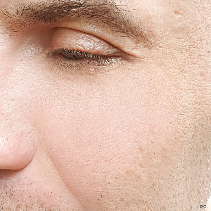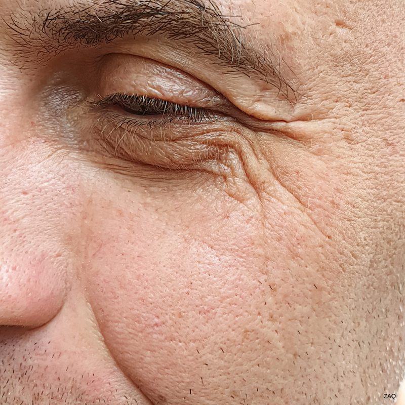 Close-up of a person's eye with visible wrinkles and skin texture.